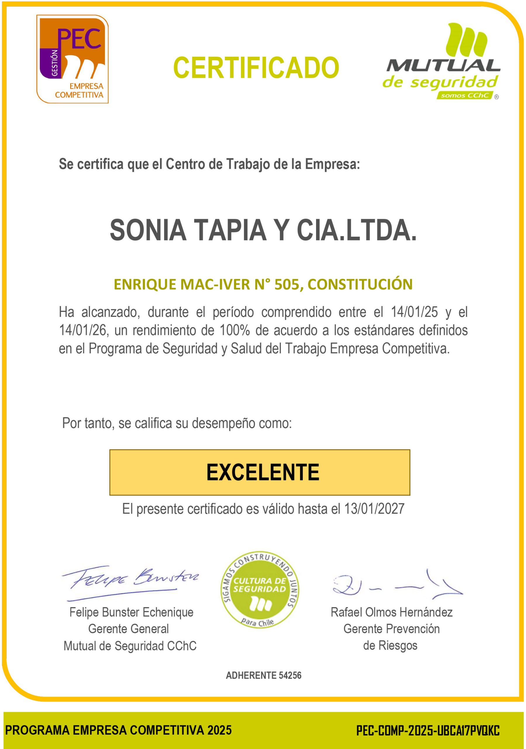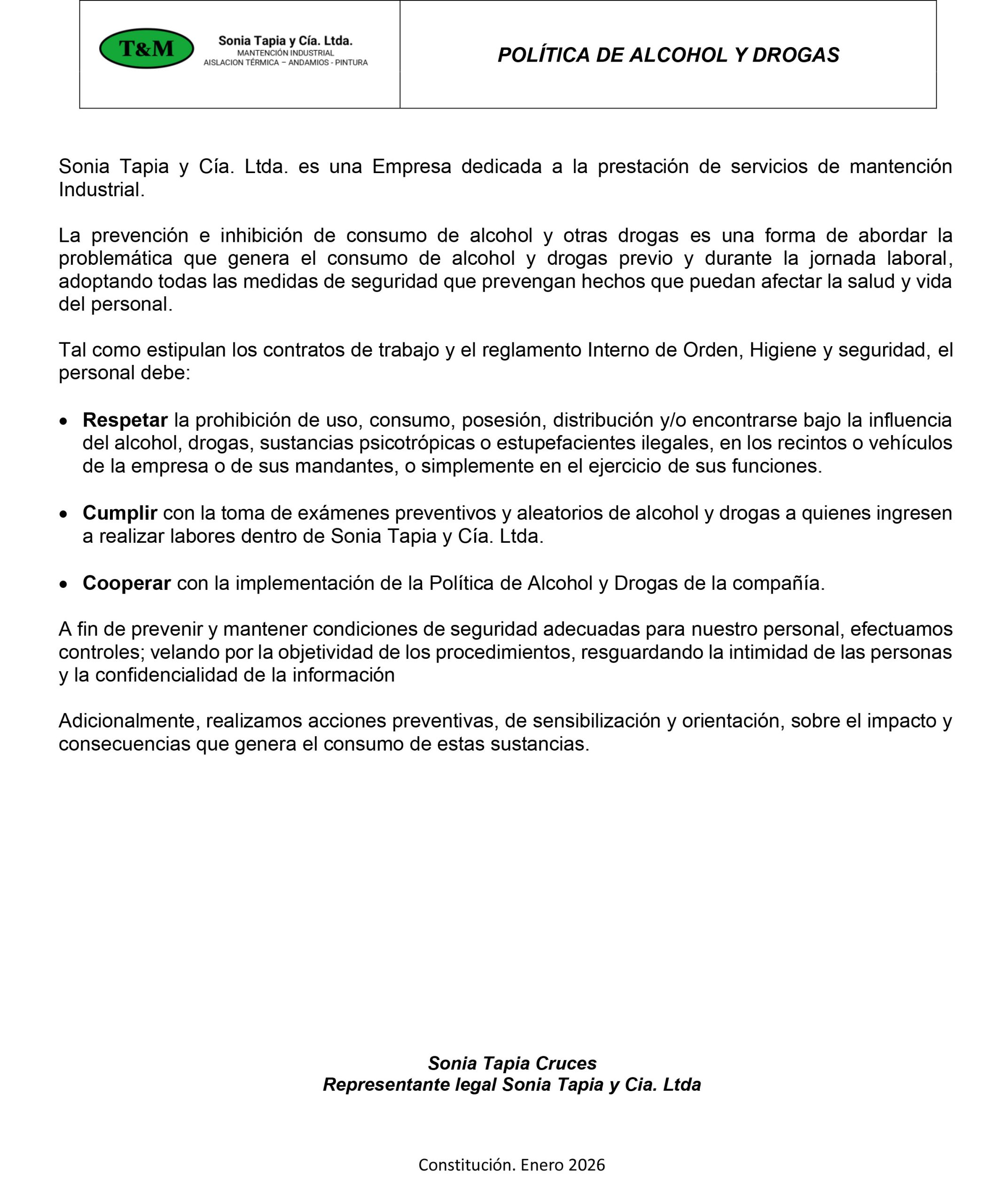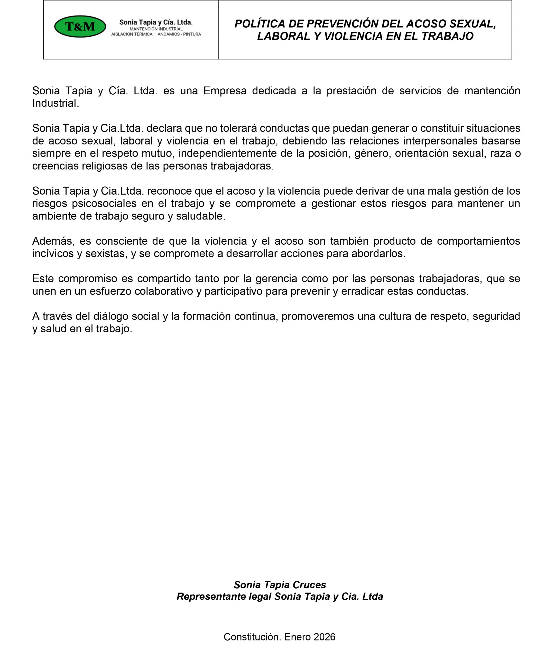 Nuestra empresa Sonia Tapia y Cía. Ltda.(TyM Ltda.), se formó en abril del año 2001, en la ciudad de Constitución, con el objetivo de prestar servicios a Celulosa Arauco y Constitución S.A. y empresas locales relacionadas principalmente a la industria forestal.